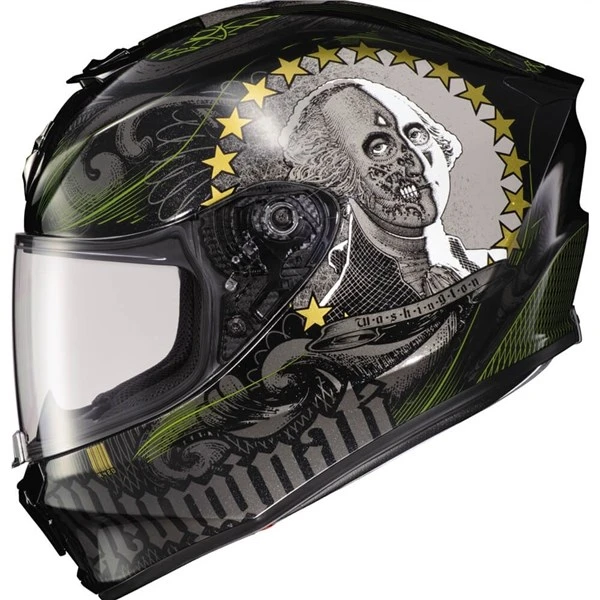 The EXO-R420 helmet continues to set a new standard for Scorpion EXO’s full face street helmets. State of the art materials, performance features, sleek modern design, refined fit, and a dual safety homologation at a very competitive price point. The advanced polycarbonate shell is more aerodynamic and smaller resulting in an ultra lightweight SNELL approved helmet. The aero tuned ventilation system uses a large top vent and mouth vents engineered to allow more airflow to the riders head while maintaining low noise levels. The EXO-R420 features an Ellip-tec II face shield with a latching shield locking mechanism located in the lower center of the shield. This makes the face shield more secure and provides a tighter seal against the gasket. The face shield can easily be removed without tools, and the EverClear No Fog coating helps keep your vision clear in cold and damp environmental conditions. The KwikWick II comfort liner is moisture wicking, quick drying and can be easily removed and is machine washable.
