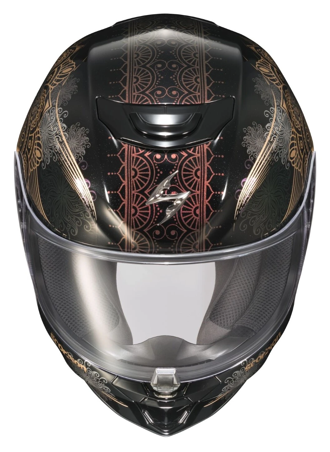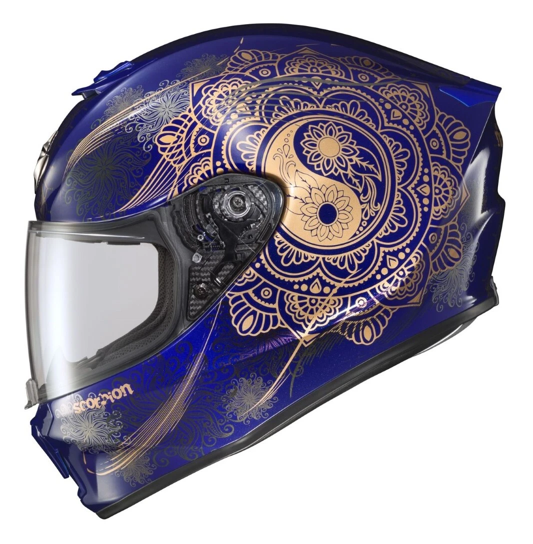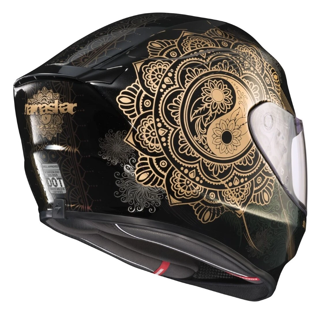 Respect the ride. The EXO-R420 Namaskar Helmet continues to set the standard for Scorpion EXO’s full face street helmets. The advanced LG polycarbonate shell is more aerodynamic and smaller resulting in an ultra lightweight SNELL-approved helmet. The aero tuned ventilation system uses a large top vent and mouth vents engineered to allow more airflow to the rider’s head while maintaining low noise levels. The EXO-R420 features the Elliptec II face shield which has a latching shield locking mechanism located in the lower center of the shield. This makes the face shield more secure and provides a tighter seal against the gasket. The face shield can be easily removed without tools, and the EverClear No-Fog coating helps keep your vision clear in cold and damp environmental conditions. The KwikWick II liner is moisture wicking, anti-microbial, quick drying and can be easily removed and is machine washable.